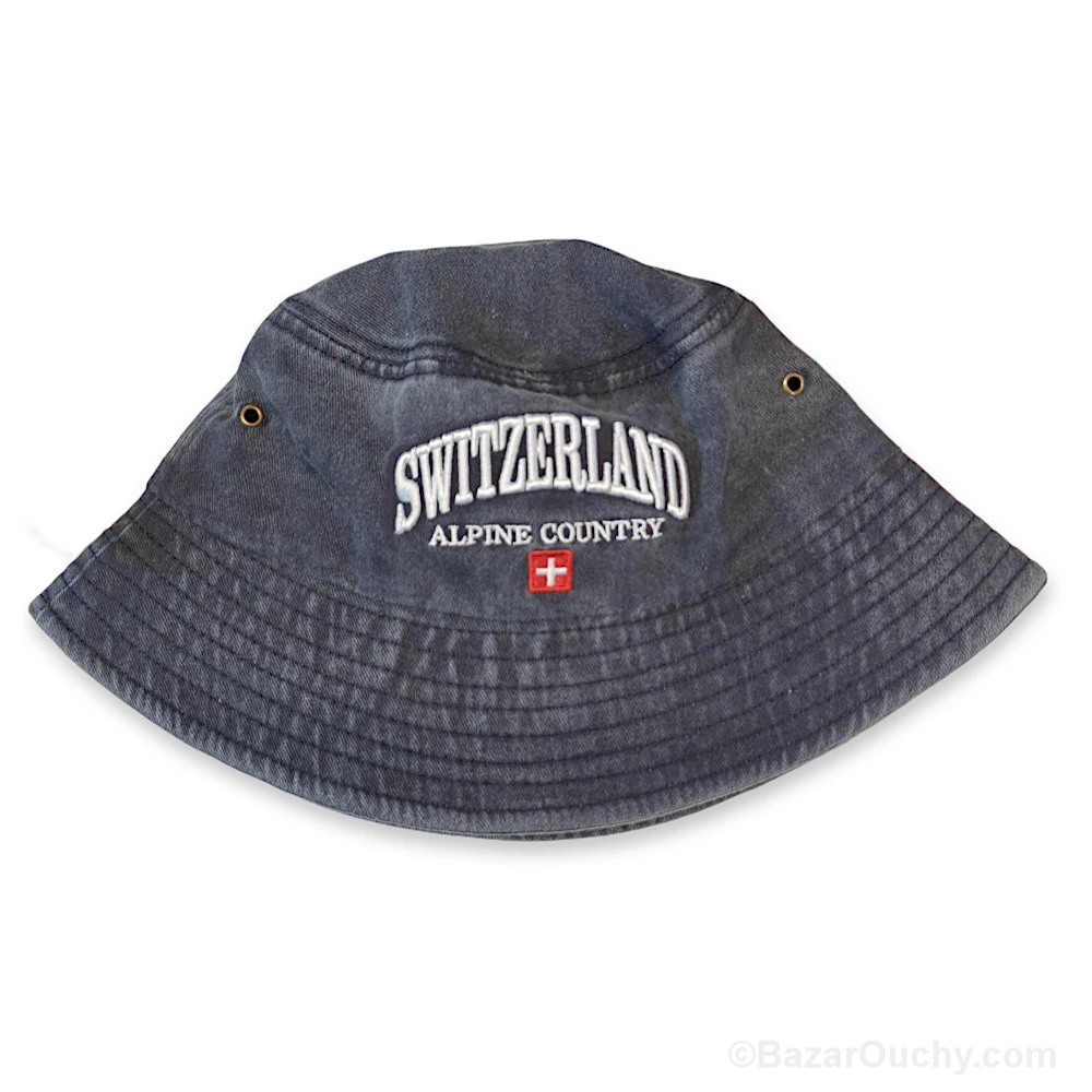 Joli bob (chapeau) suisse bleu en tissus épais, avec inscription suisse brodée.