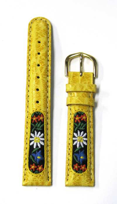 Bracelet de montre folklorique suisse, brodé avec fleurs des Alpes (Edelweiss, gentiane, rhododendron). Type Jordi.