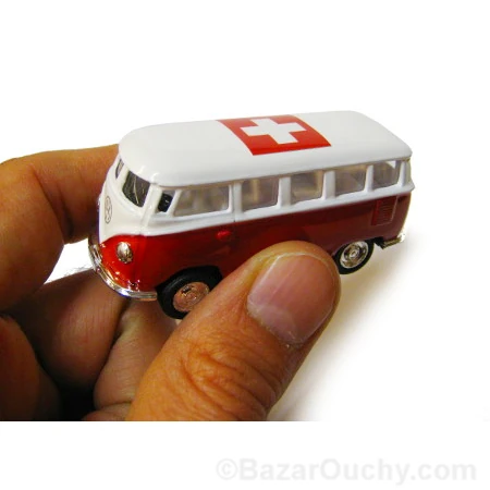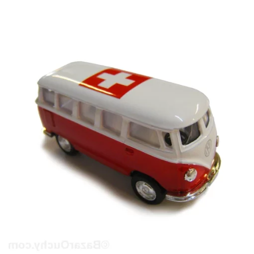 Petit bus VW avec croix suisse. Porte qui s’ouvre.