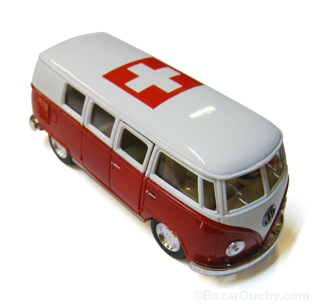 Volkswagen classical Bus (1962) avec croix suisse. Porte latérale et arrière s’ouvrent.