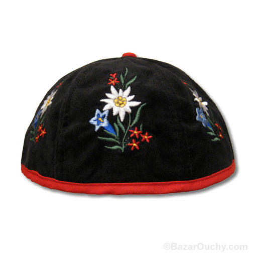 Capet d’armailli suisse traditionnel. En tissu noir, brodé de bouquet (edelweiss, gentiane et rhododendron) tout autour.