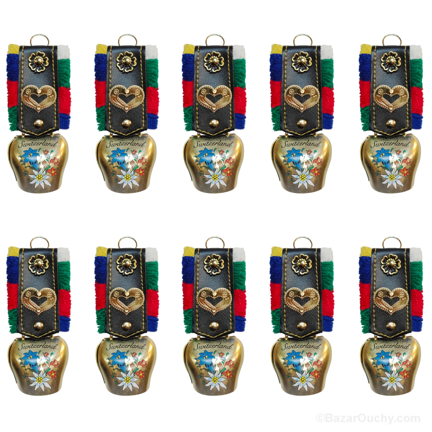 Cloche suisse décorative en métal avec motifs fleurs des Alpes (Edelweiss, gentiane & rhododendrons) et courroie avec franges de couleurs.