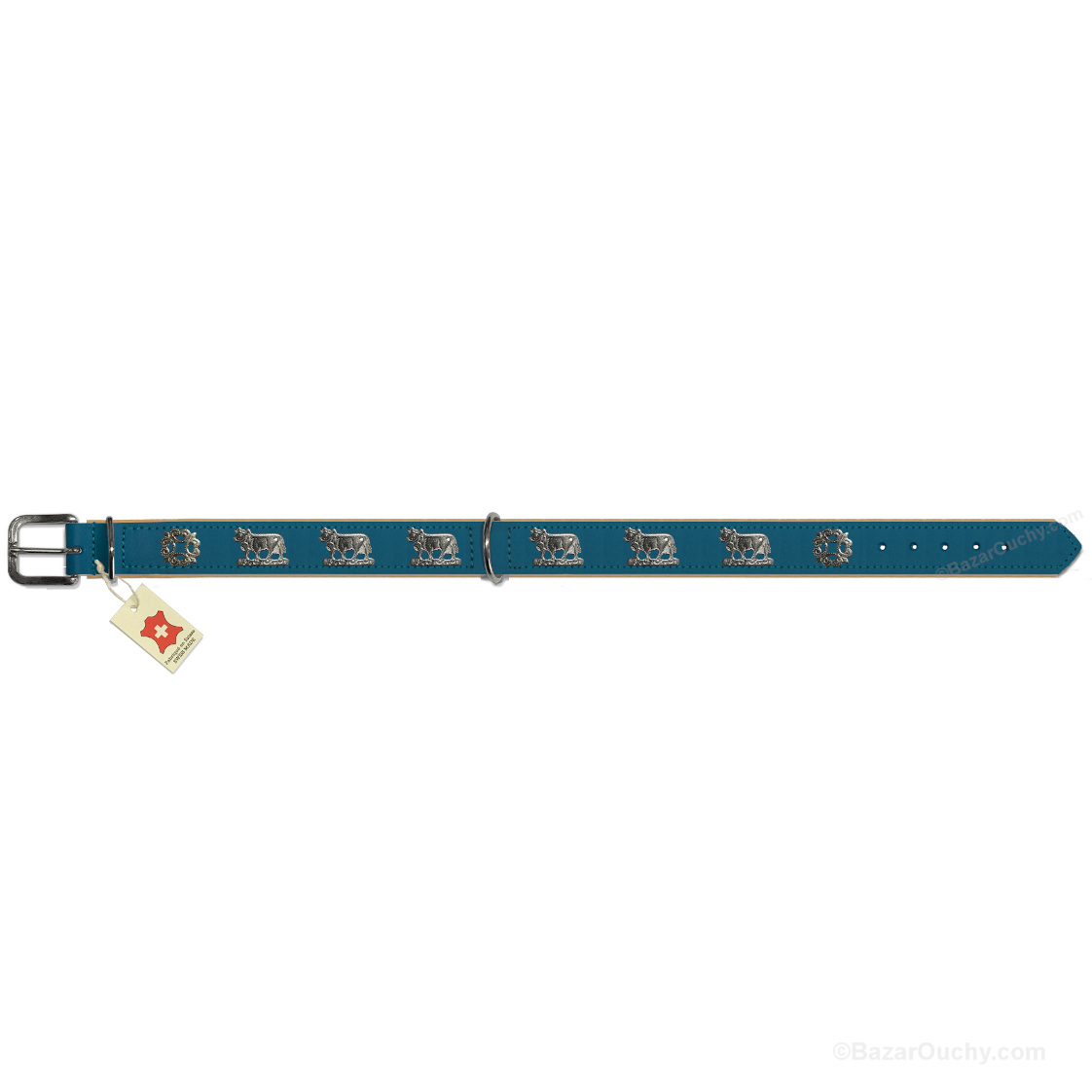 Collier suisse appenzellois en cuir pour chien avec vaches en laiton rivetées, fait main. En cuir élégant, doublé et cousu pour assurer une résistance et une souplesse optimale. Les vaches sont rivetées à la main, de façon à ne laisser aucune partie pouvant gêner l'animal. L'anneau pour accrocher la laisse est solide et fiable.