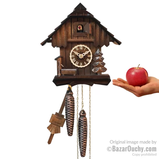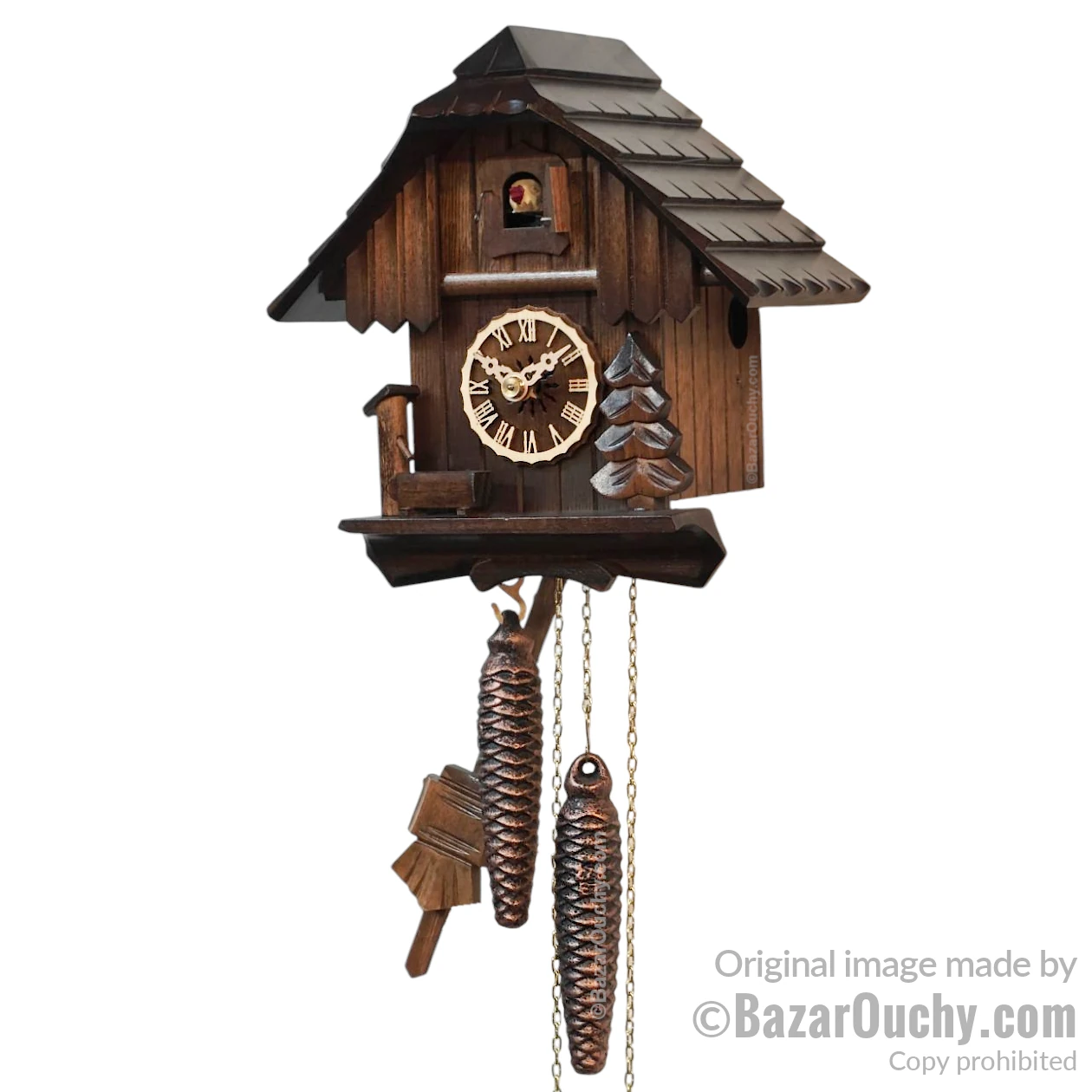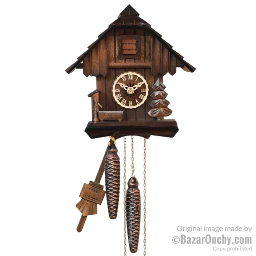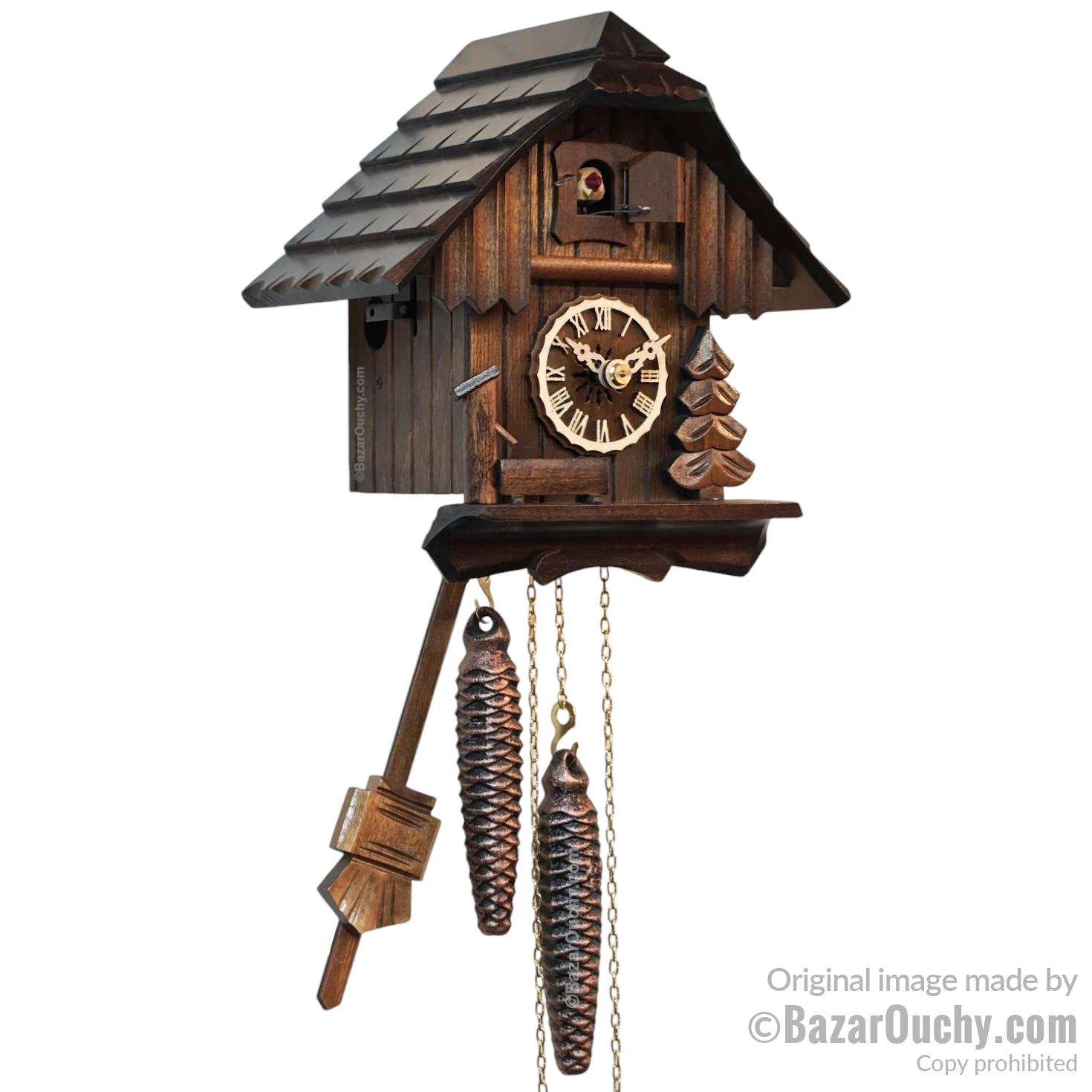 Ce coucou mécanique fonctionne à l'aide de contrepoids qu'il suffit de remonter une fois par jour en tirant sur la chaîne. Le son est produit par des soufflets qui imitent le chant du coucou. Un levier situé sur le côté, ou au-dessous, permet d'arrêter le son si désiré.