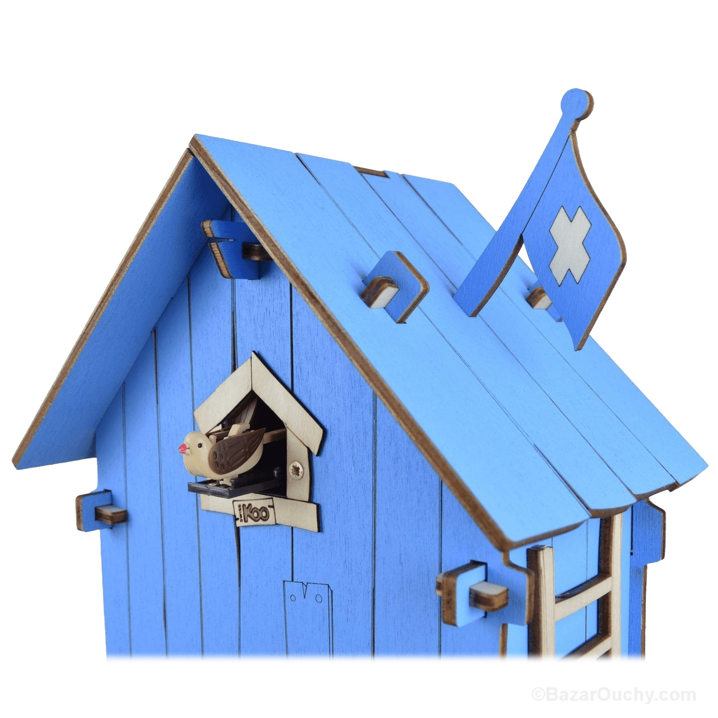 - Le coucou possède un détecteur de nuit, dès qu'il n'y a plus de lumière le coucou arrête automatiquement de sortir et chanter