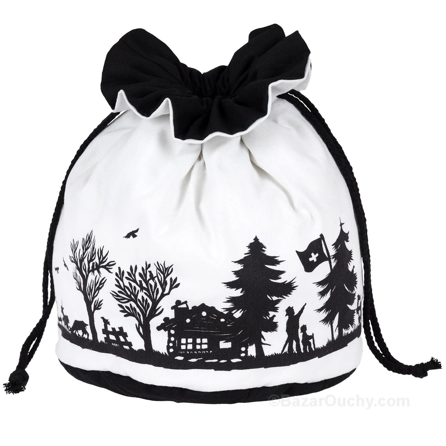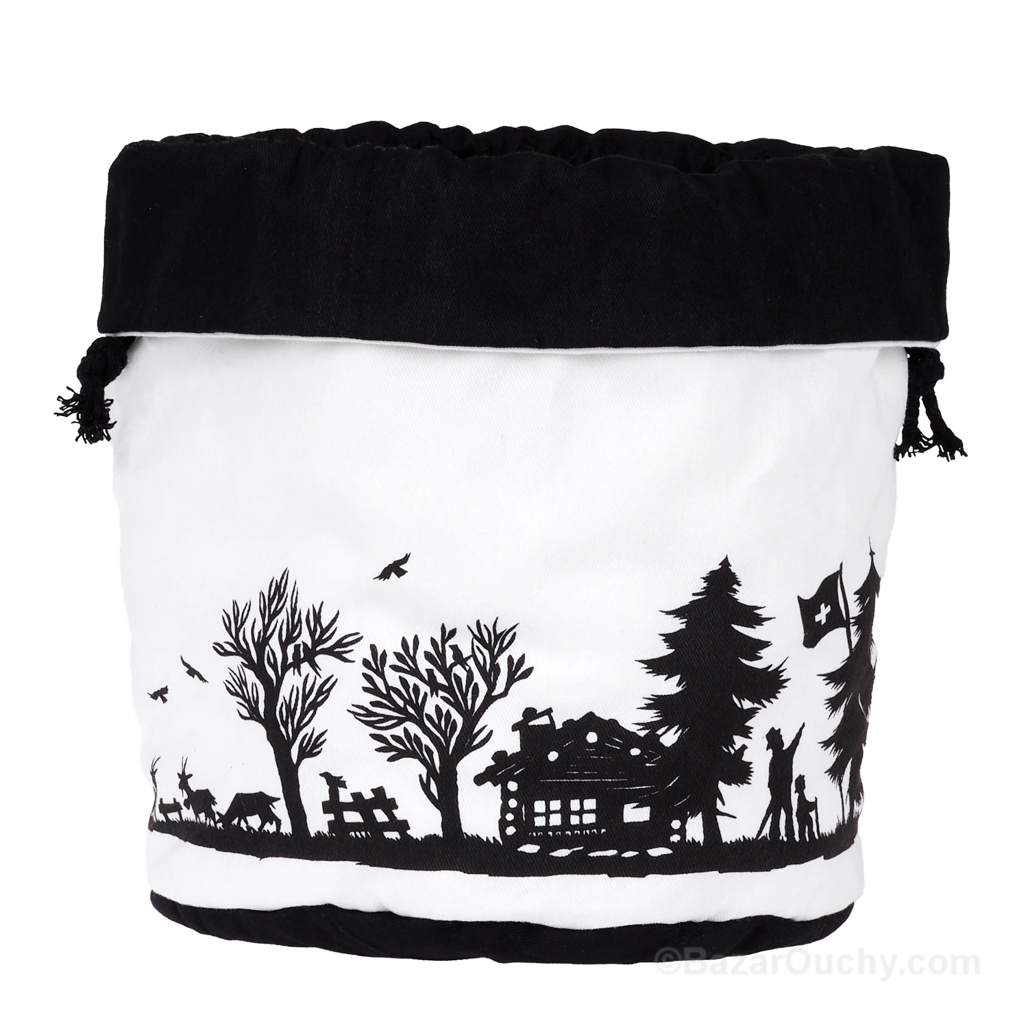 Sac à patates avec motif poya découpage tissés, noir et blanc. Idéal pour garder bien au chaud ses patates à raclette et fondue!