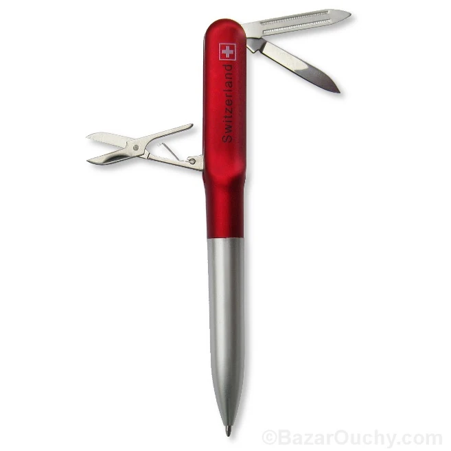 Stylo à bille avec couteau multifonctions dépliable du manche.