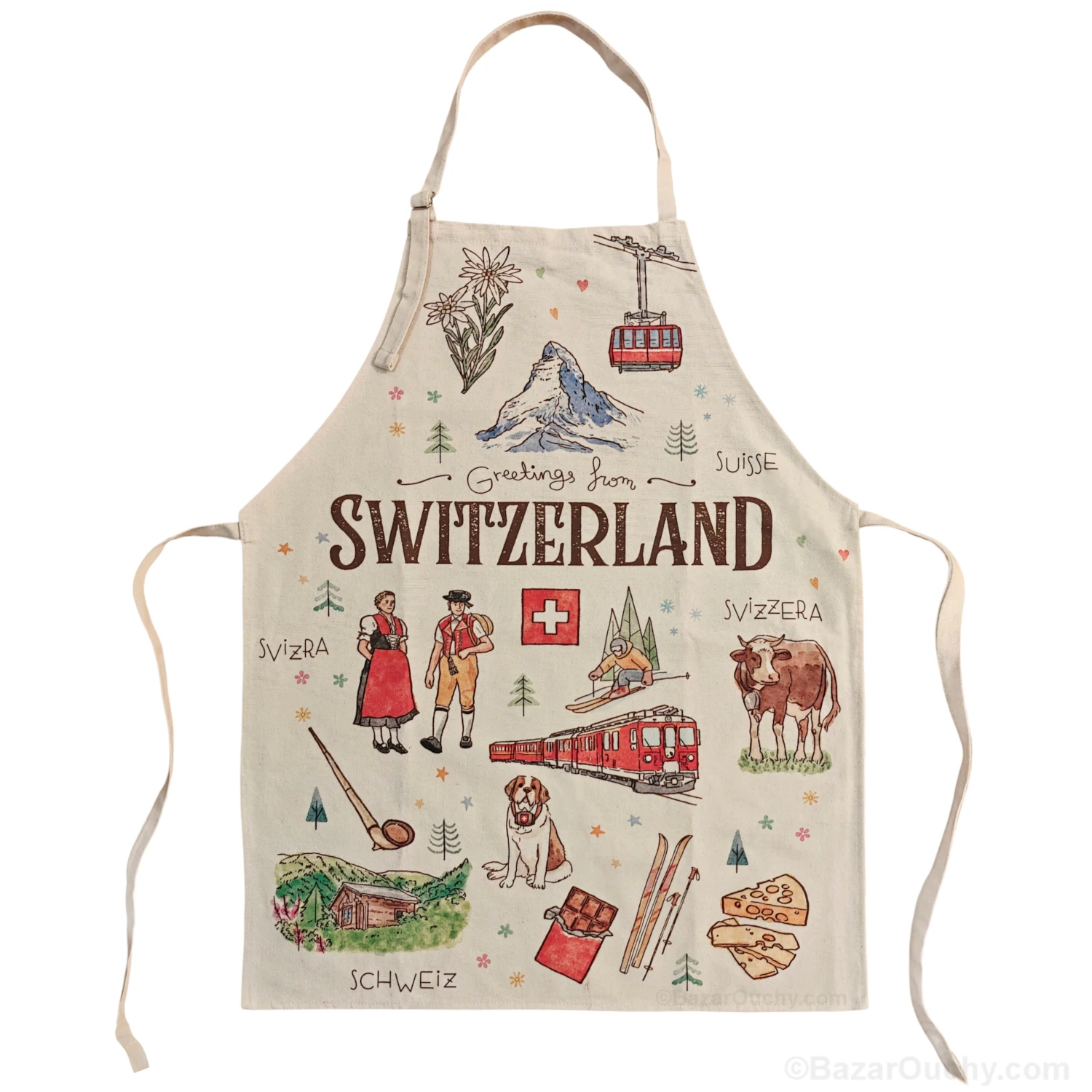 Tablier de cuisine en tissu avec dessins typiques suisses.