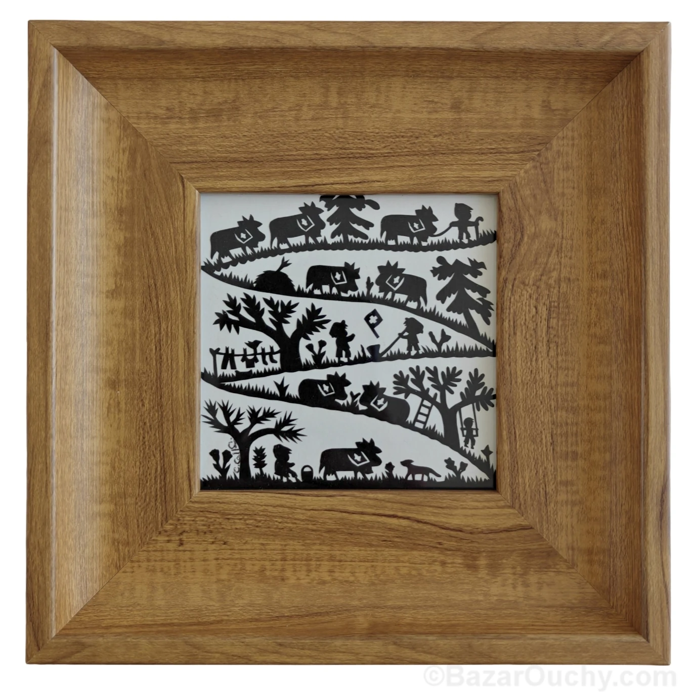 Dimensions du cadre : 18.5 x 18.5 cm (avec pied pour être posé sur une table et crochet pour être suspendu au mur)
